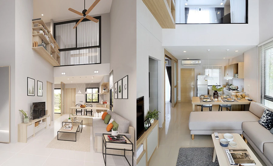 ภายในออกแบบให้เป็น Double Space โปร่ง โล่ง ดูกว้างขวาง สามารถรับแสงธรรมชาติได้อย่างเต็มที่ ซึ่งเป็นวิถีบ้านแบบญี่ปุ่นเลยค่ะ ที่เขาจะชอบรับแสดงธรรมชาติเข้าบ้านเยอะๆ เปิดรับลมธรรมชาติ แล้วช่วยเพิ่มการระบายอากาศภายในบ้านได้อย่างทั่วถึง