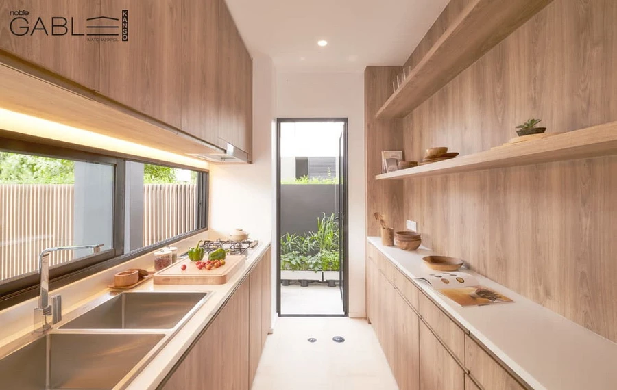 พื้นที่ครัว เฟอร์นิเจอร์เกือบทั้งหมดก็ยังเน้นไปที่ไม้