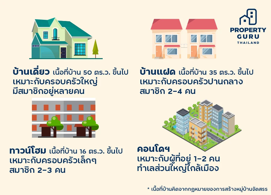 บ้านที่อยากได้ เหมาะกับไลฟ์สไตล์ และความเป็นอยู่หรือไม่ เช่น ใช้ชีวิตอยู่คนเดียว หรือกับแฟนแค่สองคน ทำงานเป็นมนุษย์เงินเดือนทั่วไป แต่จะซื้อบ้านเดี่ยวหลังใหญ่ พื้นที่ 50 ตร.ม. ขึ้นไป ก็อาจจะดูไม่ตอบโจทย์การใช้ชีวิตเท่าไหร่ จริงอยู่ว่าการมีบ้านใหญ่อาจจะเป็นความใฝ่ฝัน แต่ยิ่งหลังใหญ่ เนื้อที่เยอะก็จะยิ่งมีราคาสูงขึ้นไปอีก ถ้าเปลี่ยนเป็นคอนโด หรือทาวน์โฮม 2 ชั้น เนื้อที่ไม่มาก ก็อาจจะตอบโจทย์มากกว่าค่ะ อย่างไรก็ตาม หากมีกำลังทรัพย์เพียงพอ และอยากอยู่บ้านหลังใหญ่ก็ไม่ใช่เรื่องผิดอะไรค่ะ ทั้งนี้ก็ให้ดูบ้านที่เหมาะสมกับไลฟ์สไตล์และกำลังทรัพย์ของเราเป็นหลักจะดีกว่า นอกจากนี้ไลฟ์สไตล์อื่นๆ เช่น มีการวางแผนว่าจะมีลูกในอนาคต เป็นครอบครัวขยาย ก็เป็นไปได้ว่าจะมองหาเป็นบ้านแฝด หรือบ้านเดี่ยว ก็จะตอบโจทย์มากกว่าเช่นกันค่ะ