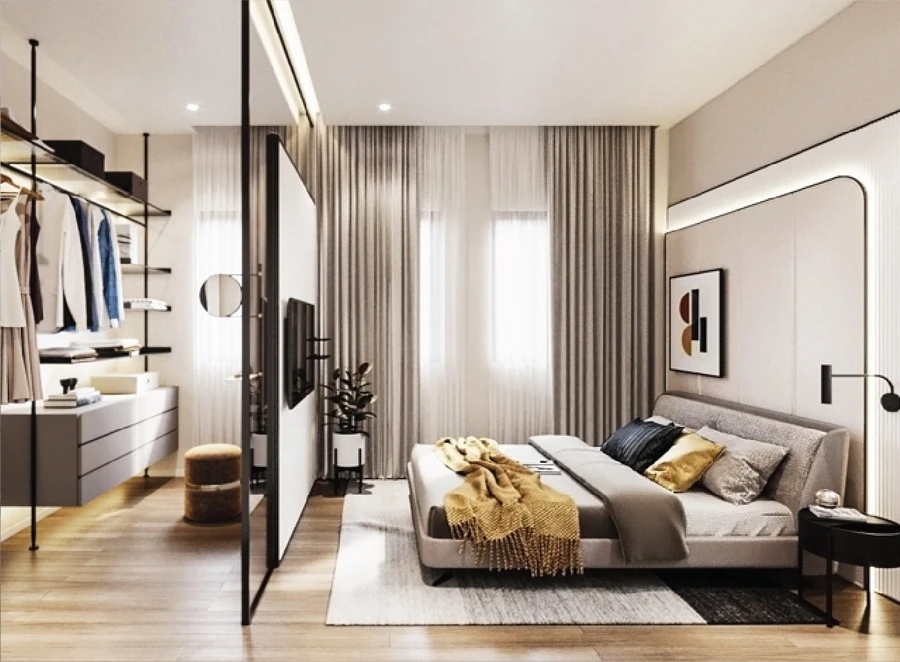 ห้องนอนก็กว้างขวาง มีพื้นที่จัดวางของได้อย่างเป็นระเบียบ แบ่งห้อง Walk-in Closet ในตัวได้