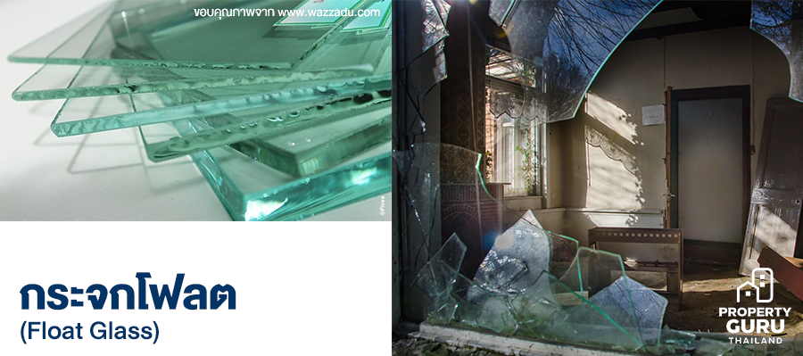 กระจกโฟลตใส (Float Glass) ค่าการตัดแสงจะเพิ่มขึ้นตามความหนาของกระจก เวลาแตกจะเป็นแบบฟันฉลาม เป็นซีกๆ ที่ทำให้เกิดอันตรายได้ กันความร้อนได้ค่อนข้างน้อย ซึ่งมีสี, ขนาดกระจก และความหนาของกระจกให้เลือกหลายรูปแบบ เหมาะกับการใช้งานในส่วนที่ไม่ได้รับแรงกระแทกหนักๆ ราคาก็ย่อมเยากว่ากระจกแบบอื่นๆ