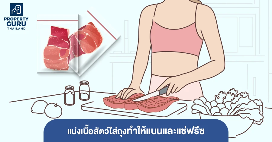 2. หั่นเนื้อหรือแบ่งเนื้อใส่ถุงซิปล็อกหรือถุงแกงก็ได้ค่ะ แต่ต้องพับถุงหรือรัดให้แน่น กดเนื้อให้แบนเพื่อให้ความเย็นทั่วถึง โดยแบ่งไว้ให้พอดีในแต่ละครั้ง เช่น ถุงละ 300 กรัม ก็จะพอดีต่อการทำกับข้าว 1 จาน *สิ่งที่ควรระวังคือระวังอย่าให้อากาศเข้าไปในถุงหรือให้เข้าน้อยที่สุด