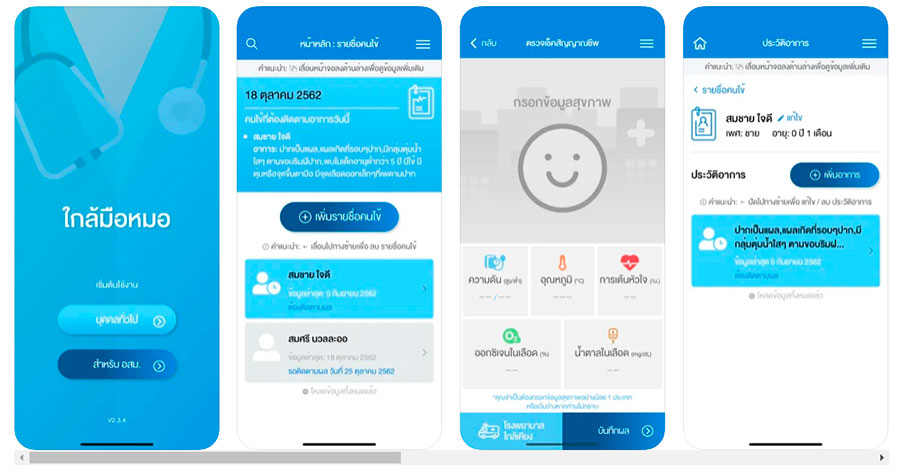 แอป ใกล้มือหมอ เปิดให้บริการเมื่อปี 2562 เป็นแอปฯ ที่หาหมอออนไลน์ได้ตลอด 24 ชั่วโมงแบบฟรีๆ ไม่มีค่าใช้จ่าย ให้บริการช่วยคัดกรองโรคทั่วไป พูดคุยกับหมอผ่านระบบแชท โดยการส่งข้อความไว้แล้วรอคุณหมอจะเข้ามาตอบคำถามให้ทีหลัง พูดคุยกับหมอเกี่ยวกับอาการเบื้องต้นเพื่อประเมิณอาการก่อนตัดสินใจรักาษา รวมไปถึงการซักประวัติเบื้องต้นผู้ที่สงสัยว่าจะเป็นผู้ป่วยโควิด-19 เพื่อประเมิณความเสี่ยงว่าเป็นมากน้อยแค่ไหน หากมีอาการรุนแรงก็สามารถค้นหาโรงพยาบาลใกล้เคียง พร้อมเบอร์โทรศัพท์ และแผนที่จากบนแอปได้เลยทันที และยังสามารถบันทึกประวัติและอาการป่วยเพื่อติดตามผลย้อนหลังได้ด้วย