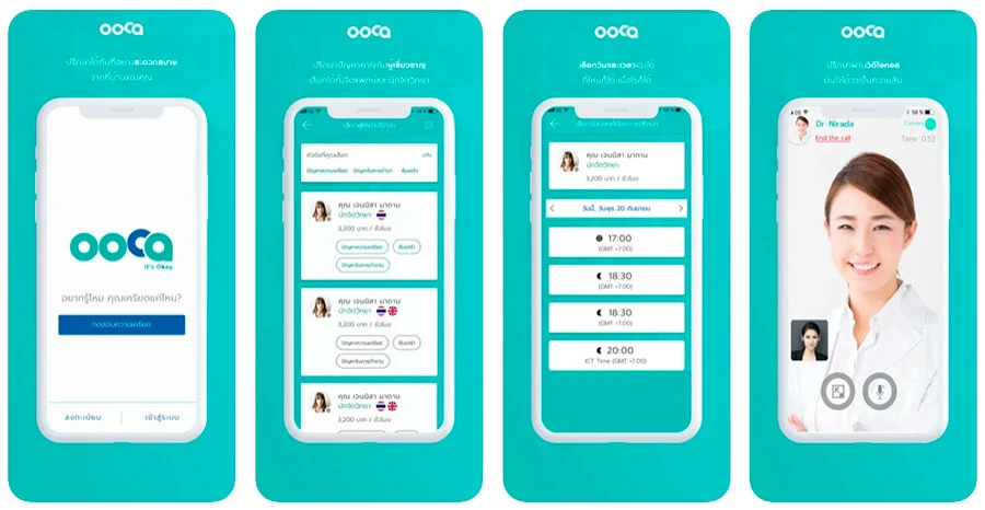 แอปพลิเคชัน Ooca เปิดให้บริการเมื่อปี 2560 สำหรับปรึกษาปัญหาสุขภาพจิต โดยจิตแพทย์และนักจิตวิทยามืออาชีพ เกือบ 100 ท่าน ผ่าน Video Call แบบส่วนตัวผ่านคอมพิวเตอร์หรือโทรศัพท์มือถือ หากมีแพทย์กำลังออนไลน์อยู่ก็สามารถเริ่มปรึกษาพูดคุยกับแพทย์ได้เลย หรือเลือกวันเวลาที่สะดวกในการพบแพทย์หลังจากนั้นรอผู้ให้แพทย์ติดต่อกลับผ่าน VDO Call นอกจากนี้ในแอปพลิเคชันยังมีแบบทดสอบความเครียด เพื่อที่เราจะสามารถประเมินระดับและอาการของตัวเองเบื้องต้นได้