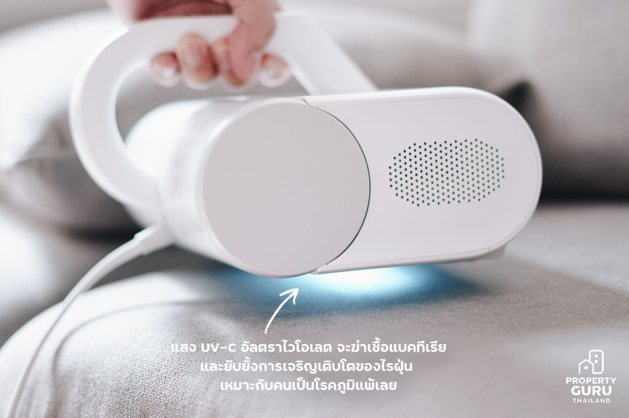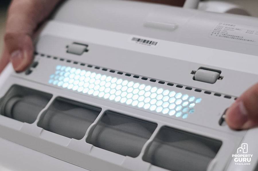 อย่างที่บอกว่าเจ้าเครื่องดูดไรฝุ่นอัจฉริยะเครื่องนี้นาง ให้ความร้อนสูงถึง 50°C มีท่อลมแบบเรียบจะถ่ายเทอุณหภูมิ 50°C เจาะเข้าไปในฟูกนอน เบาะโซฟา หรืออื่นๆ เพื่อดูดไรฝุ่น ระบายความชื้น และฆ่าเชื้อแบคทีเรียได้ แสงสีฟ้าๆ ที่เราเห็นคือ แสง UV-C ฆ่าเชื้อแบคทีเรีย ดูดกำจัดสารก่อภูมิแพ้และไรฝุ่นต่างๆ