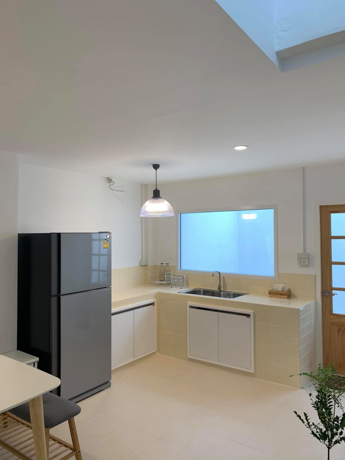 พอขยับมาที่โซนครัว สำหรับหลังนี้เจ้าของบ้านออกแบบให้เป็นครัวเปิด ทำเคาน์เตอร์เอง ก่อปูน ปูกระเบื้อง โดยใช้กระเบื้อง TCI สีครีมไอยรา 4 x 4 นิ้ว ส่วนบานซิงค์ คิทโซ่ zer s ft 6080 บานซิงค์ บานทึบ เหมาะกับบ้านที่ทำอาหารเล็กๆ น้อยๆ ไม่ได้ต้มผัดแกงทอดจนกลิ่นคลุ้งเท่าไหร่ มีโซนวางของใช้และเก็บของได้พอดีๆ พื้นด้านล่างเป็นกระเบื้องก็สามารถเช็ดล้างทำความสะอาดได้ง่าย