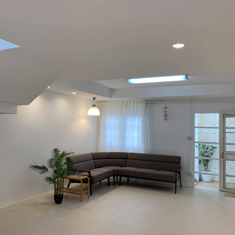 มาดูชั้น 1 กันก่อนเลย ตอนแรกแทบไม่เชื่อว่า บ้านเก่าสภาพประมาณนี้จะรีโนเวทให้สวยคลีนได้ขนาดนี้ โดยยังคงโครงสร้างเก่าไว้ไม่ได้ทุบรื้อส่วนหลักๆ แต่ปรับพื้น ฝ้าเพดาน ทาสีใหม่ โดยเลือกใช้วัสดุเรียบง่าย สีโทนอ่อน ช่วยให้ห้องดูโล่งกว้างมากขึ้น พอเดินเข้ามาในบ้าน เปิดโล่ง มองทะลุไปเห็นถึงโซนครัวได้เลย