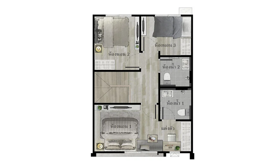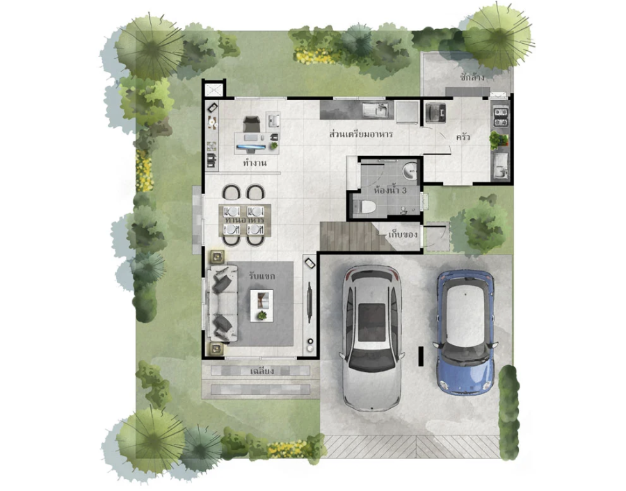 5. Huvvi (แสนสราญ) บ้านแฝด พื้นที่ใช้สอย 147 ตร.ม 3 ห้องนอน ห้องอเนกประสงค์ 3 ห้องน้ำ ห้องรับประทานอาหาร ห้องครัว ที่จอดรถ 2 คัน