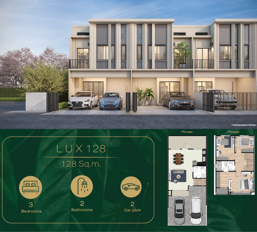 2. LUX 128 : พื้นที่ใช้สอยขนาด 128 ตร.ม. ขนาด 3 ห้องนอน 2 ห้องน้ำ 2 ที่จอดรถ