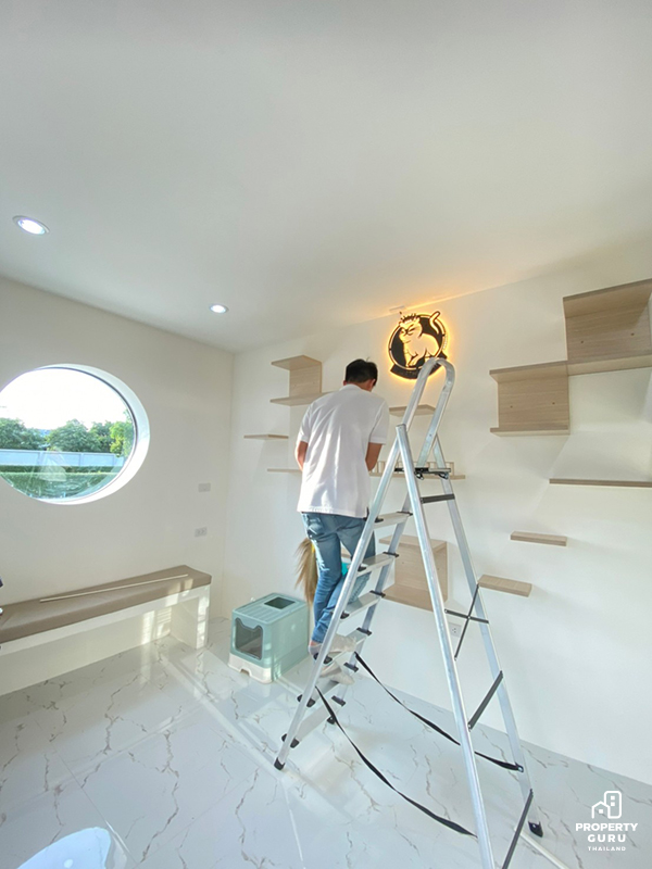 ขั้นตอนก่อสร้างตอนแรกดูเหมือนว่าจะง่ายๆ เพราะเรามองว่ามันเป็นแค่ห้องเล็กๆ ห้องหนึ่งค่ะ แต่โจทย์คือเป็นห้องที่จะมีสิ่งมีชีวิตอาศัยก็คือน้องแมวอยู่ ก็เลยเป็นอีกห้องที่จะต้องใส่ใจเป็นพิเศษ เริ่มตั้งแต่ลงเสาเข็ม เพราะเรามองระยะยาวห้องนี้เป็นส่วนที่ต่อเติมออกมาจากตัวบ้าน เลยกังวลเรื่องการทรุดของดิน ส่วนที่ยากที่สุดเลยคงจะเป็นส่วนการตกแต่งภายในค่ะ การกั้นห้องแบ่งสัดส่วนแต่ละห้อง ตำแหน่งติดตั้งเครื่องปรับอากาศ และการออกแบบบานประตู ให้น้องแมวรู้สึกไม่อึดอัดและอากาศถ่ายเทได้ทั่วห้องค่ะ