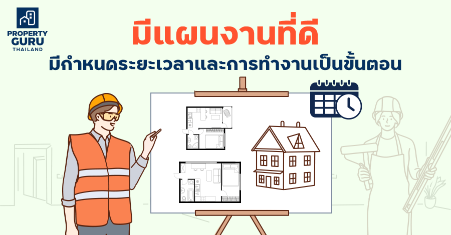 ผู้รับเหมาที่ดีจะต้องมีการทำแผนงานก่อสร้าง โดยแสดงระยะเวลาการทำงานในแต่ละขั้นตอนมาให้เราดูอย่างชัดเจนและเข้าใจง่าย ซึ่งการวางแนงานที่ดีนั้นจะเกิดจากความรู้ และประสบการณ์ในการทำงานของผู้รับเหมา เช่น การบริหารคนงาน การสั่งวัสดุล่วงหน้า การหมุนเวียนเงินทุน และการจัดการกับปัญหาหน้างานที่อาจเกิดขึ้น และที่สำคัญคือ จะต้องควบคุมเวลาในการก่อสร้างให้เป็นไปตามแผนงานที่ได้จัดวางไว้ด้วย