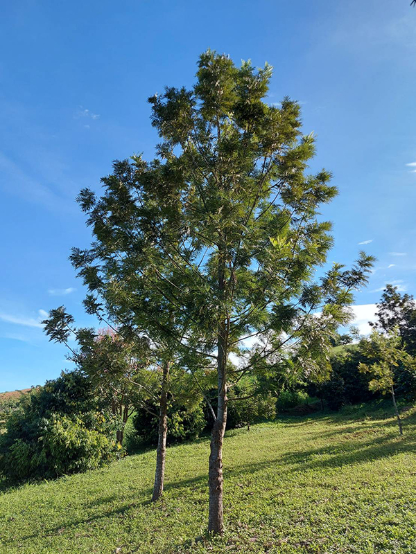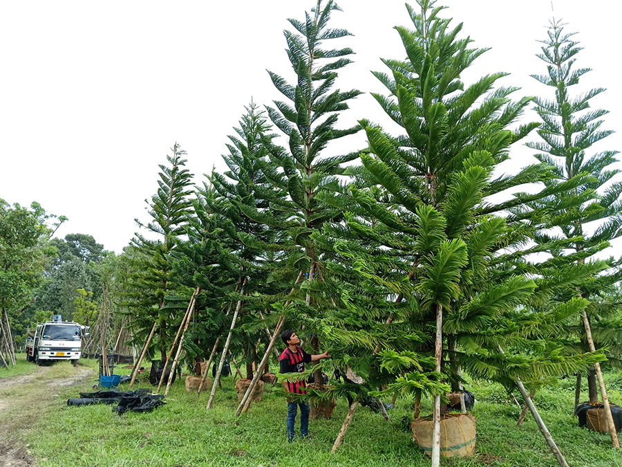 สนฉัตรเป็นไม้ยืนต้นที่สูงได้ถึง 60 เมตร กิ่งก้านจะแผ่ออกเป็นแผงรูปสามเหลี่ยมเป็นชั้นๆ ลดหลั่นกันไปคล้ายฉัตร ปลูกง่ายไม่ต้องดูแลมาก สามารถบังแดดได้ดี