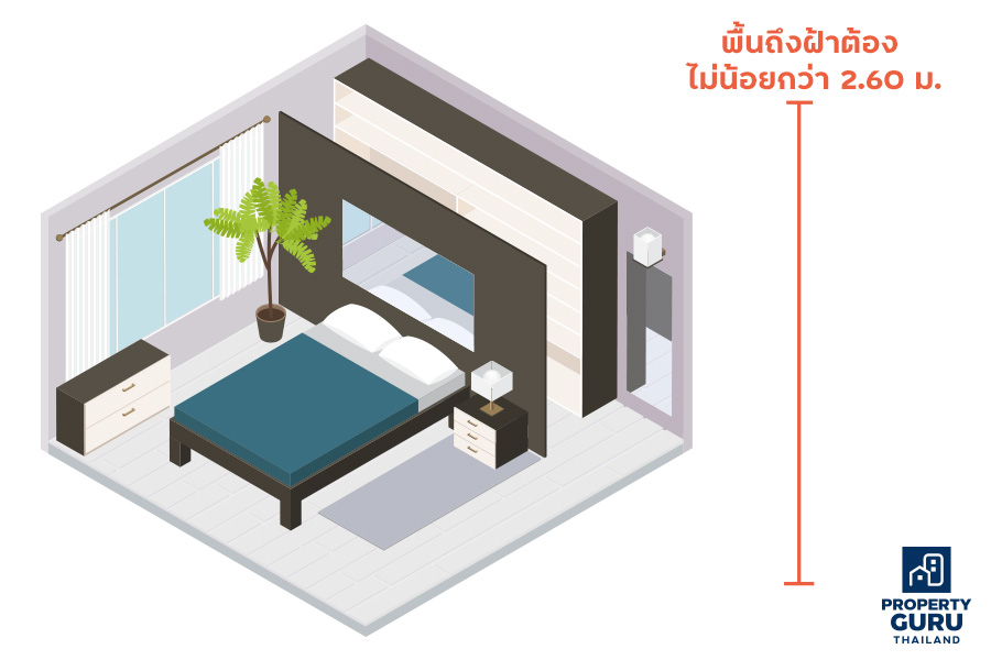 • ห้องพักอาศัยในแต่ละห้องของบ้านเดี่ยว ต้องมีความสูงพื้นถึงฝ้า ไม่น้อยกว่า 2.60 เมตร (ข้อ 22 กฎกระทรวงฉบับที่ 55)