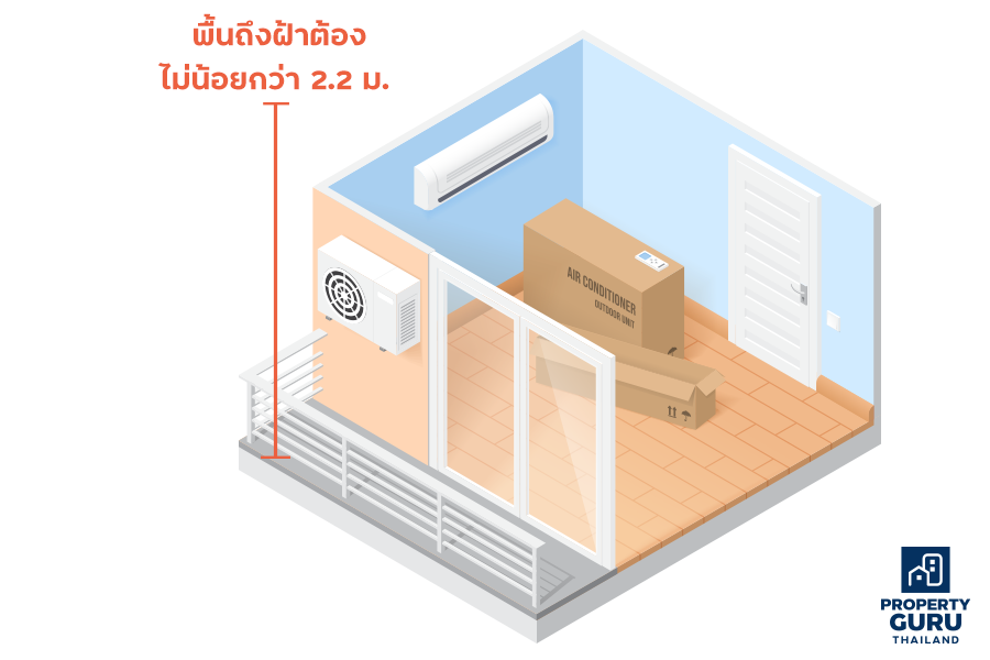 • ระเบียงของบ้านเดี่ยวแต่ละระเบียง ต้องมีความสูงพื้นถึงฝ้าไม่น้อยกว่า 2.20 เมตร (ข้อ 22 กฎกระทรวงฉบับที่ 55)