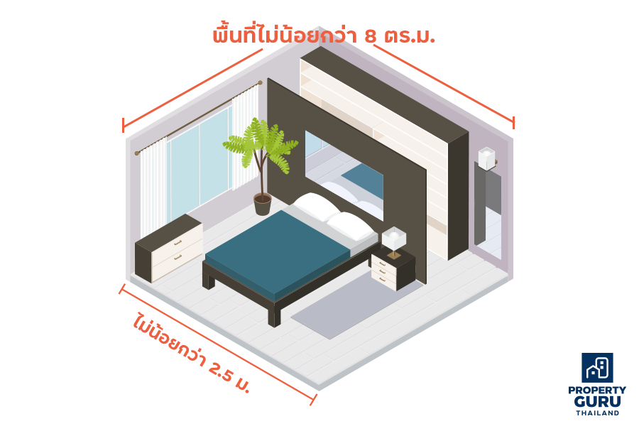• ห้องนอนในบ้านเดี่ยวให้มีความกว้างด้านแคบที่สุดไม่น้อยกว่า 2.50 เมตร และมีพื้นที่ไม่น้อยกว่า 8 ตารางเมตร (ข้อ 20 กฎกระทรวงฉบับที่ 55)
