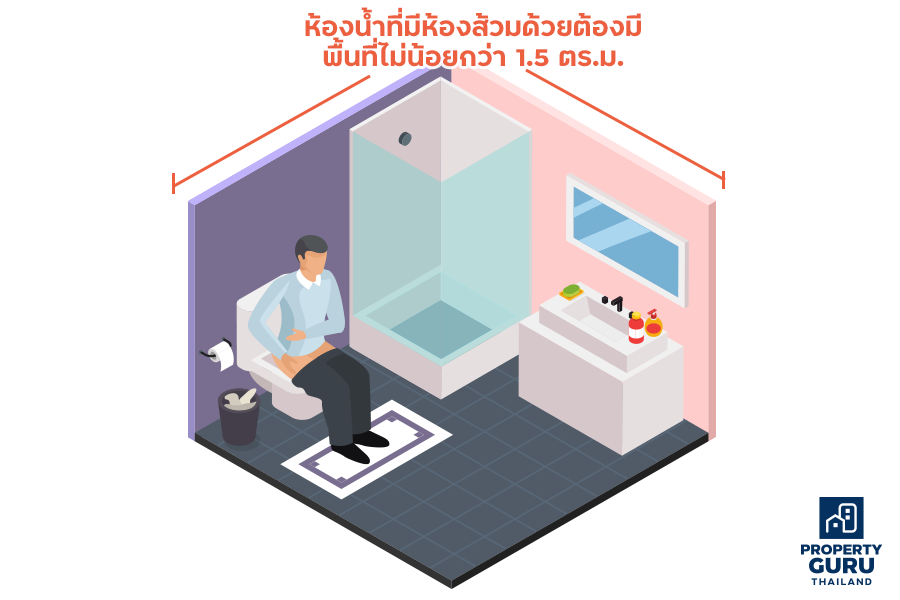 • ห้องส้วมและห้องอาบน้ำของบ้านเดี่ยว ถ้ารวมอยู่ในห้องเดียวกัน ต้องมีพื้นที่ภายในไม่น้อยกว่า 1.50 ตารางเมตร (ข้อ 61 ข้อบัญญัติ กทม)