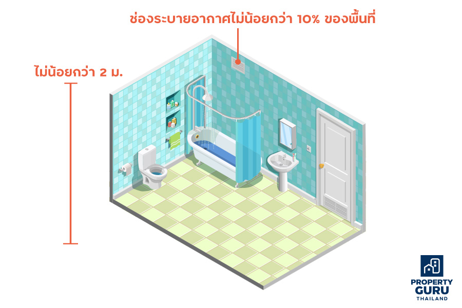 • ห้องน้ำ และห้องส้วมของบ้านเดี่ยว ต้องมีระยะดิ่งระหว่างพื้นถึงเพดาน (Floor to Ceiling) ไม่น้อยกว่า 2 เมตร (ข้อ 22 กฎกระทรวงฉบับที่ 55)