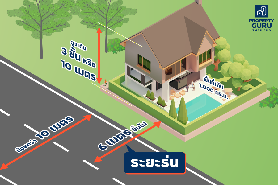 • บ้านเดี่ยวสูงเกิน 3 ชั้น หรือสูงเกิน 10 เมตร หรือมีพื้นที่เกิน 1,000 ตารางเมตรที่ก่อสร้างใกล้ถนนสาธารณะ จะต้องร่นแนวอาคารห่างจากเขตถนนสาธารณะอย่างน้อย 1 ใน 10 ของความกว้างของถนนสาธารณะ ถ้าถนนสาธารณะนั้นมีความกว้างตั้งแต่ 10-20 เมตร (ข้อ 50 (2) ข้อบัญญัติ กทม)
