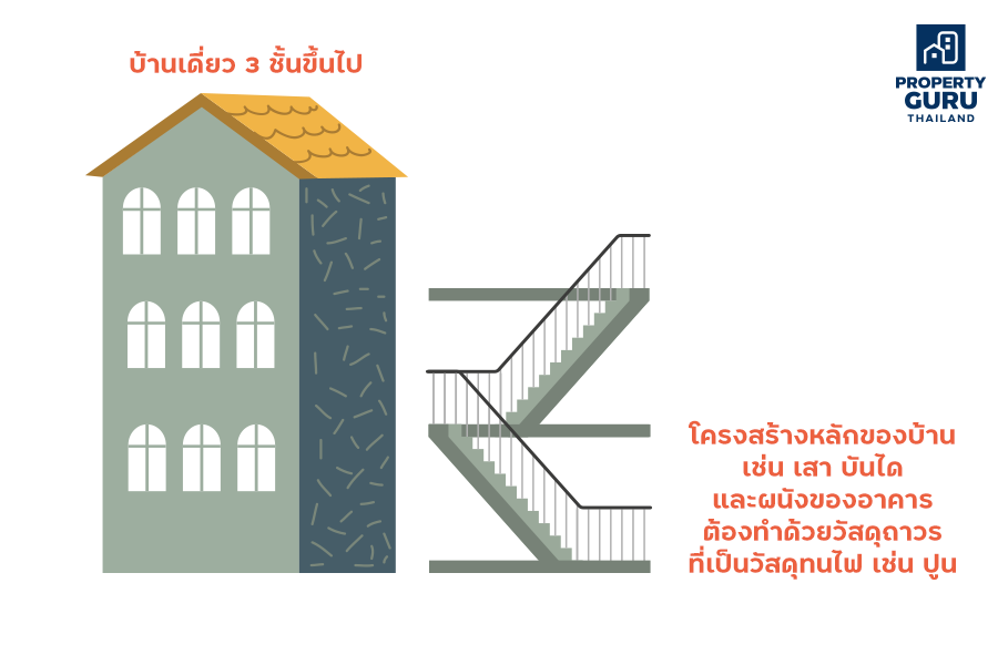 • ถ้าบ้านเดี่ยวสูงตั้งแต่ 3 ชั้นขึ้นไป โครงสร้างหลักของบ้าน เช่น เสา บันได และผนังของอาคารจะต้องทำด้วยวัสดุถาวรที่เป็นวัสดุทนไฟ เช่น ปูน (ข้อ 24 ข้อบัญญัติ กทม)