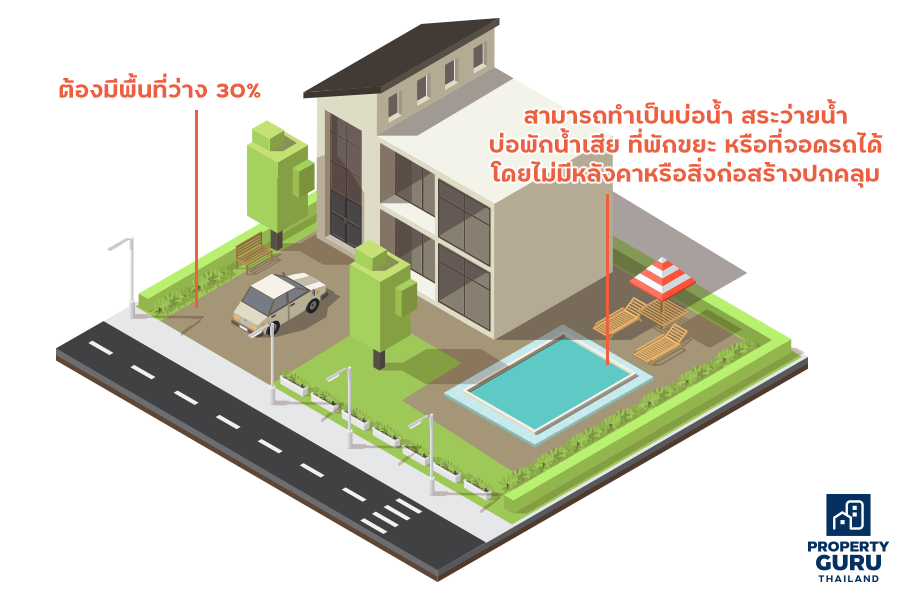 • บ้านต้องมีพื้นที่ว่างอย่างน้อย 30% ของพื้นที่ที่ดินทั้งหมดที่สร้างบ้านนั้น โดยพื้นที่ว่างนี้ไม่จำเป็นต้องปล่อยว่าง แต่สามารถทำเป็นบ่อน้ำ สระว่ายน้ำ บ่อพักน้ำเสีย ที่พักขยะ หรือที่จอดรถได้ตราบเท่าที่ไม่มีหลังคาหรือสิ่งก่อสร้างปกคลุม (ข้อ 52 ข้อบัญญัติ กทม)