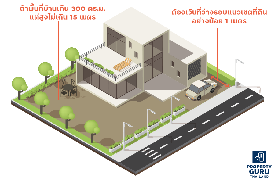 • ถ้าบ้านเดี่ยวที่จะสร้างมีพื้นที่เกิน 300 ตารางเมตร แต่สูงไม่เกิน 15 เมตร จะต้องเว้นที่ว่างรอบแนวเขตที่ดิน (รวมถึงด้านข้างบ้าน และหลังบ้าน) อย่างน้อย 1 เมตร (ข้อ 55 วรรคแรกของข้อบัญญัติ กทม)