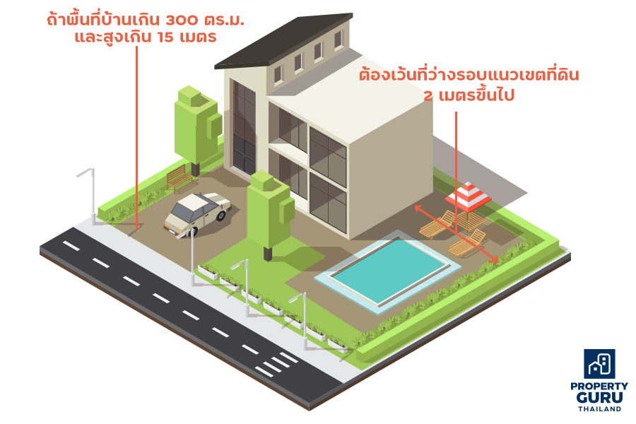 • ถ้าบ้านเดี่ยวที่จะสร้างมีพื้นที่เกิน 300 ตารางเมตร และมีความสูงเกิน 15 เมตร ต้องมีพื้นที่ว่างโดยรอบอาคาร (รวมถึงด้านข้างบ้าน และหลังบ้าน) ไม่น้อยกว่า 2 เมตร (ข้อ 55 วรรคสองของข้อบัญญัติ กทม)