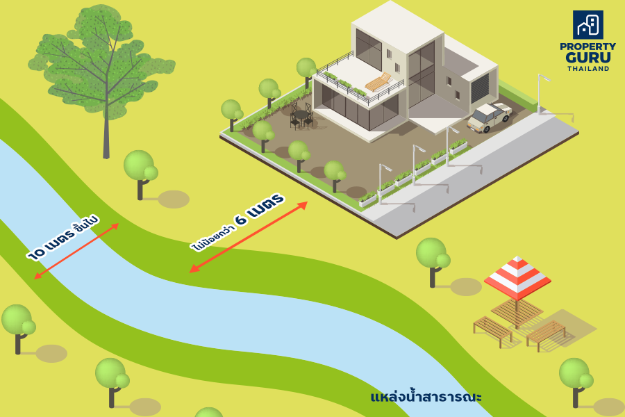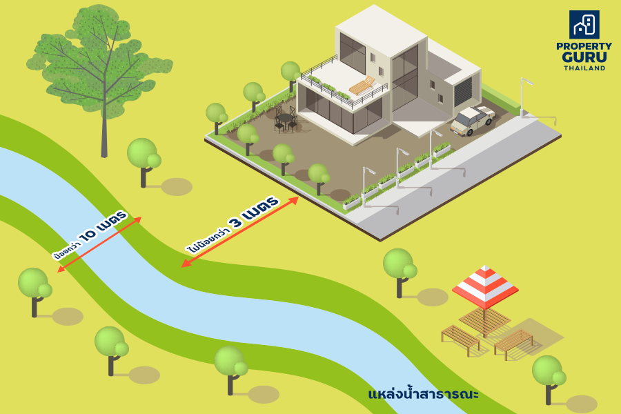 • ถ้าแหล่งน้ำนั้นมีความกว้างน้อยกว่า 10 เมตร ต้องร่นแนวอาคารให้ห่างจากเขตแหล่งน้ำนั้นไม่น้อยกว่า 3 เมตร