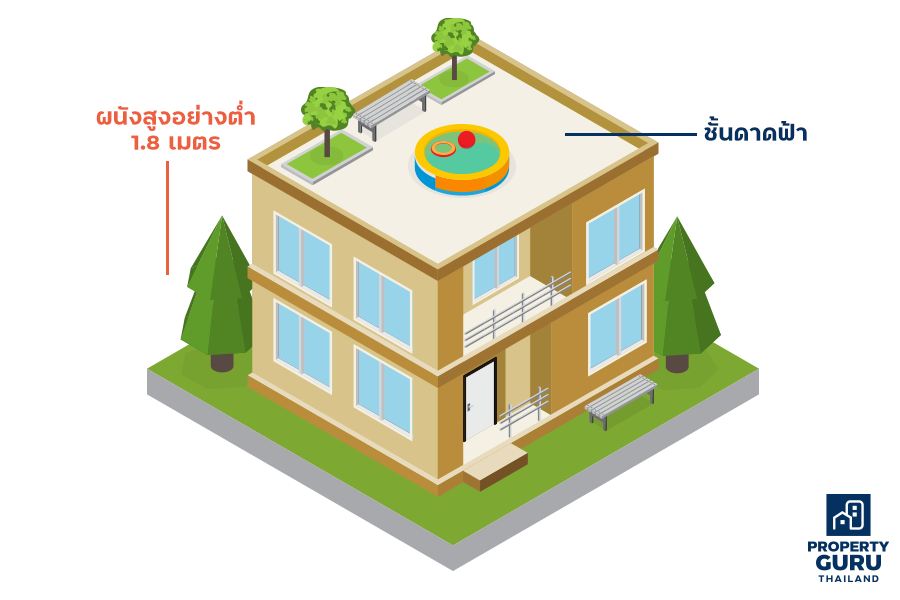 • เราสามารถออกแบบให้บ้านเดี่ยวมีชั้นดาดฟ้าได้ (ชั้นบนสุดที่ไม่มีหลังคาปกคลุม) แต่ความสูงของขั้นดาดฟ้าก็จะนับรวมด้วย และต้องมีผนังสูงอย่างต่ำ 1.8 เมตร