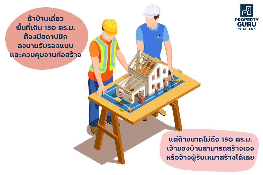 • ถ้าบ้านเดี่ยวมีพื้นที่เกิน 150 ตารางเมตร ต้องมีสถาปนิกลงนามรับรองแบบ และควบคุมงานก่อสร้าง (กฎกระทรวงกําหนดวิชาชีพสถาปัตยกรรมควบคุม พ.ศ. 2549) นั่นหมายความว่า ถ้าบ้านเดี่ยวเราเล็กขนาดไม่ถึง 150 ตารางเมตร เจ้าของบ้านสามารถสร้างเอง หรือจ้างผู้รับเหมาสร้างได้เลย โดยเจ้าของบ้านลงนามเป็นผู้ควบคุมงานก่อสร้างเองได้