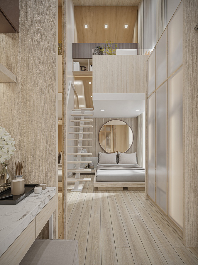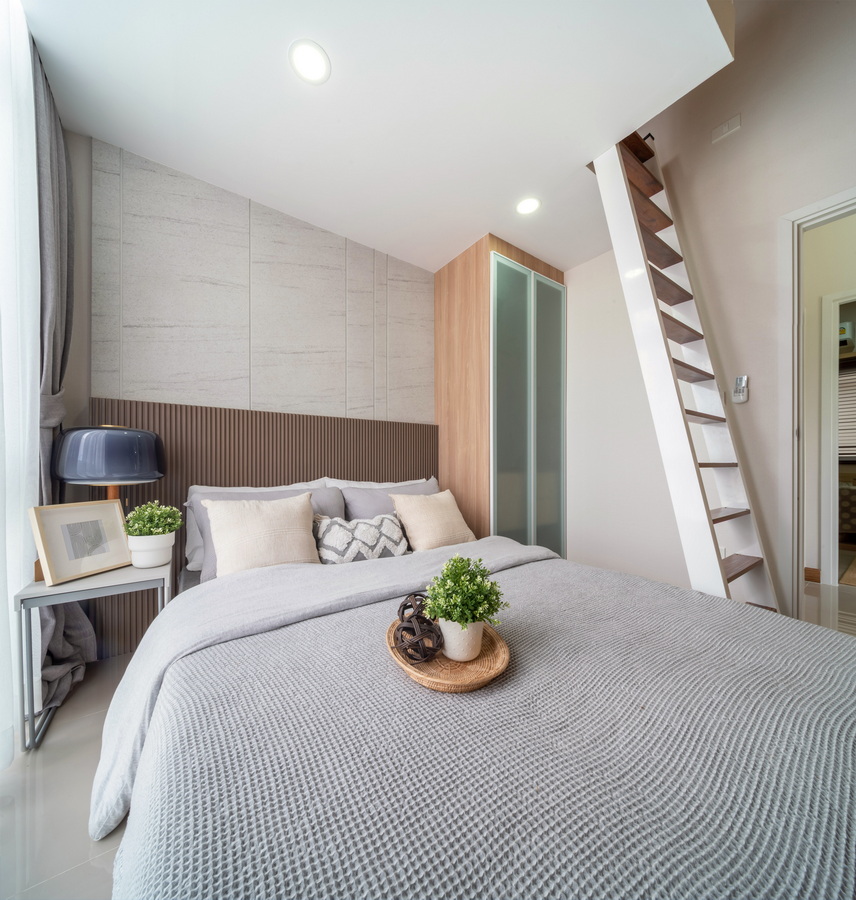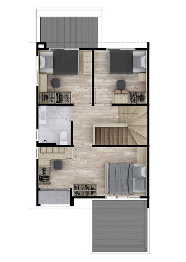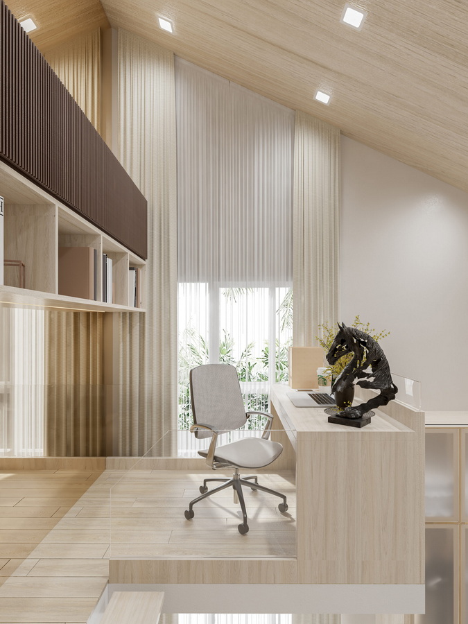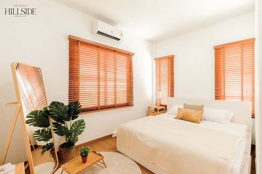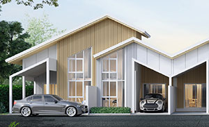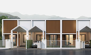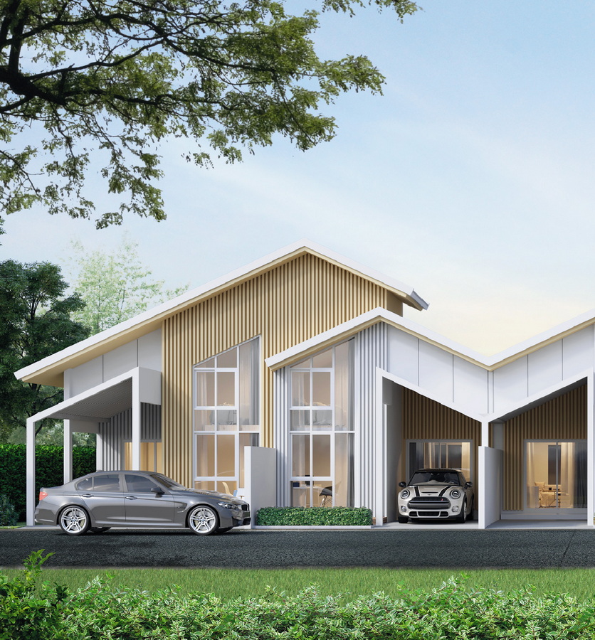 หลังคาทรงจั่วดีไซน์เล่นระดับ ที่เชื่อมต่อโครงสร้างบ้านแต่ละหลังเข้าไว้ด้วยกัน ให้ความรู้สึกเป็นอันหนึ่งอันเดียวกัน และการเล่นระแนงไม้ที่ให้ความรู้สึกโปร่งโล่ง เรียบง่าย มีมิติของแสงเงาที่งดงาม ฟังก์ชันครบทั้งห้องนอน Master Bedroom ห้องนั่งเล่น ห้องครัว และชั้นลอยห้องใต้หลังคาที่สามารถปรับเปลี่ยนการใช้พื้นที่ได้ตามความต้องการ