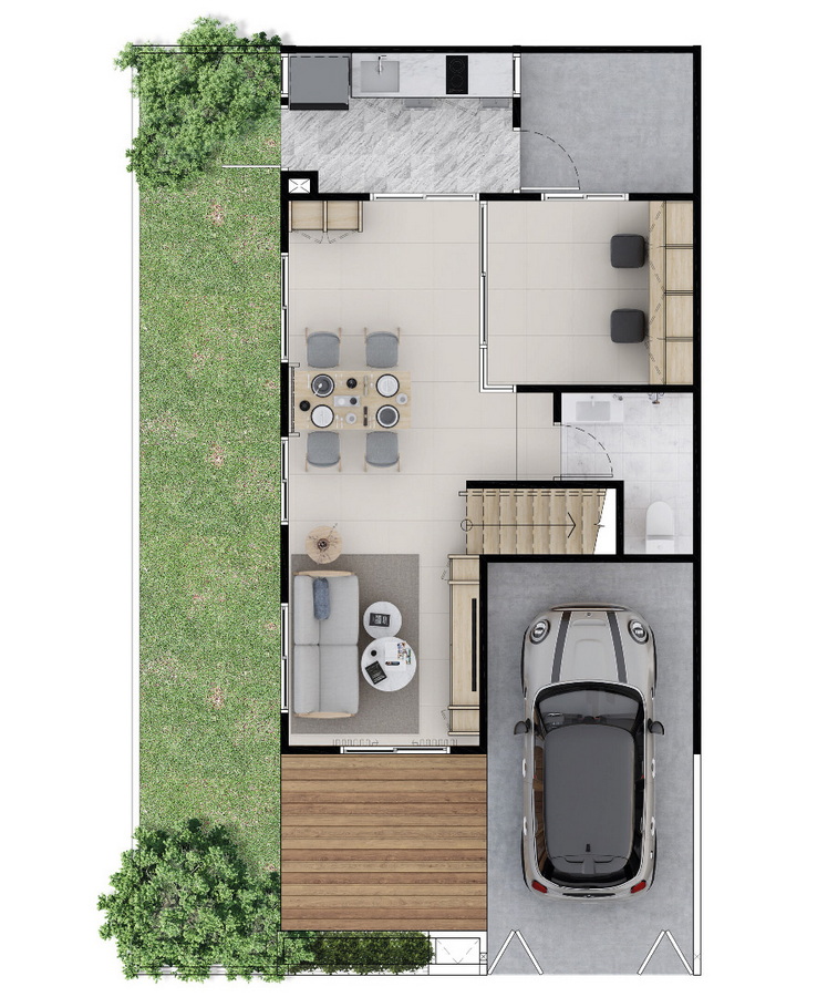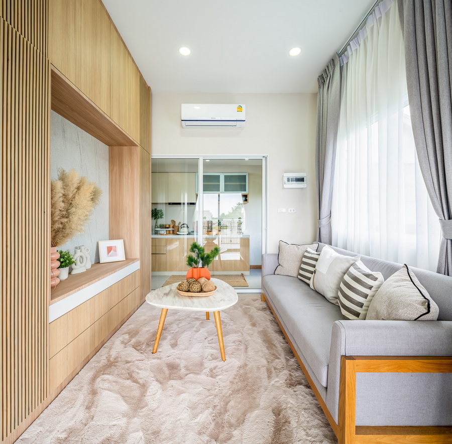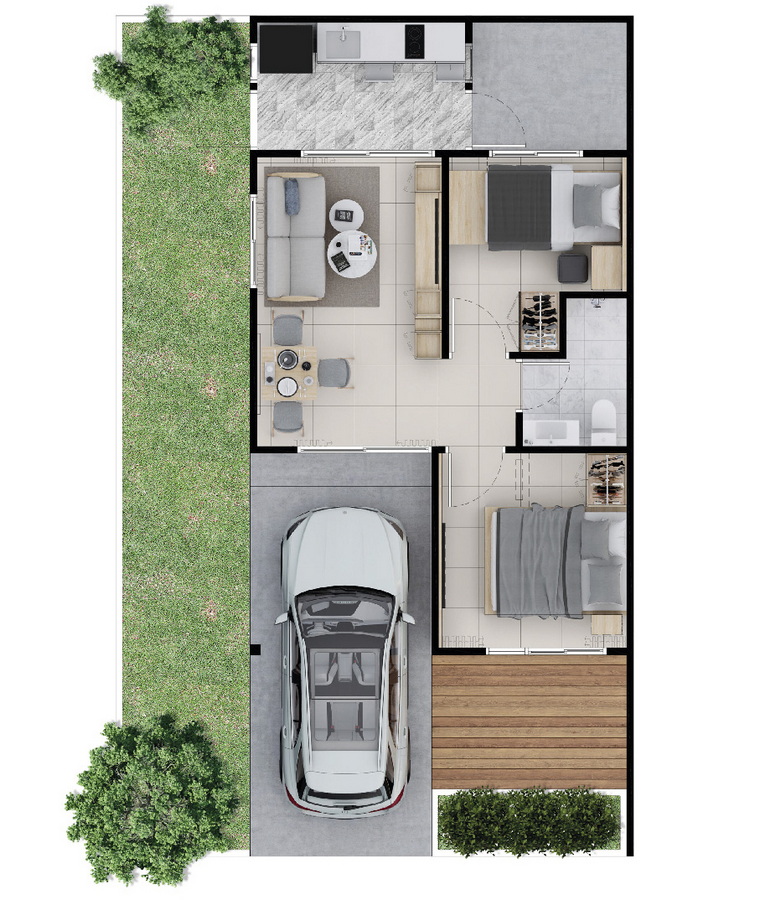 - ทาวน์โฮม 1 ชั้น พื้นที่ใช้สอย 65.5 ตารางเมตร 2 ห้องนอน 1 ห้องน้ำ ที่จอดรถ 1 คัน