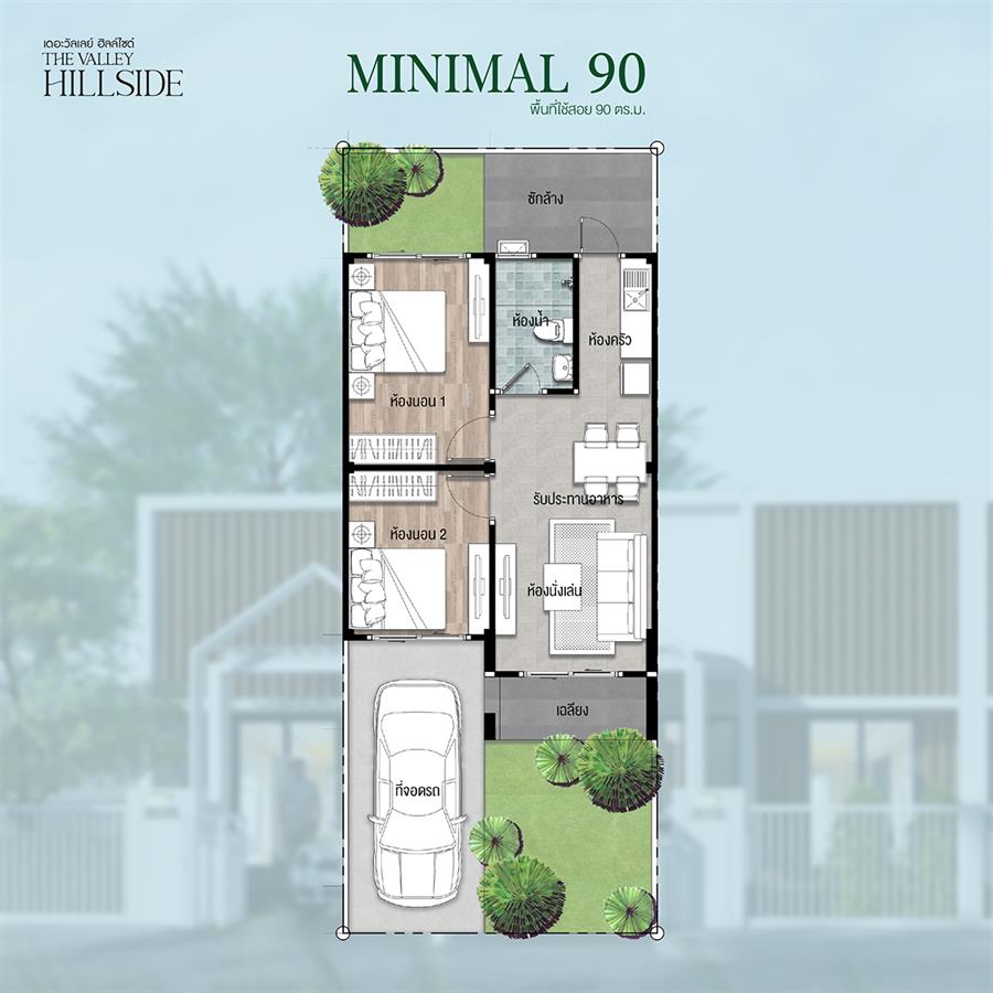 - ทาวน์โฮม Minimal 90 : หน้ากว้าง 5.80 เมตร พื้นที่ใช้สอย 90 ตารางเมตร* ฟังก์ชัน 2 ห้องนอน 1 ห้องน้ำ 1 ห้องนั่งเล่น ที่จอดรถ 1 คัน