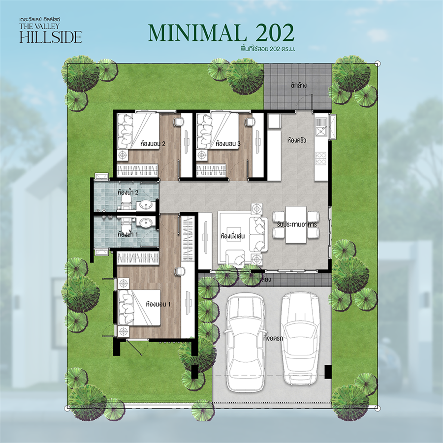 - บ้านเดี่ยว Minimal 202 : หน้ากว้าง 13.50 เมตร พื้นที่ใช้สอย 202 ตารางเมตร* ฟังก์ชัน 3 ห้องนอน 2 ห้องน้ำ 1 ห้องนั่งเล่น ที่จอดรถ 2 คัน