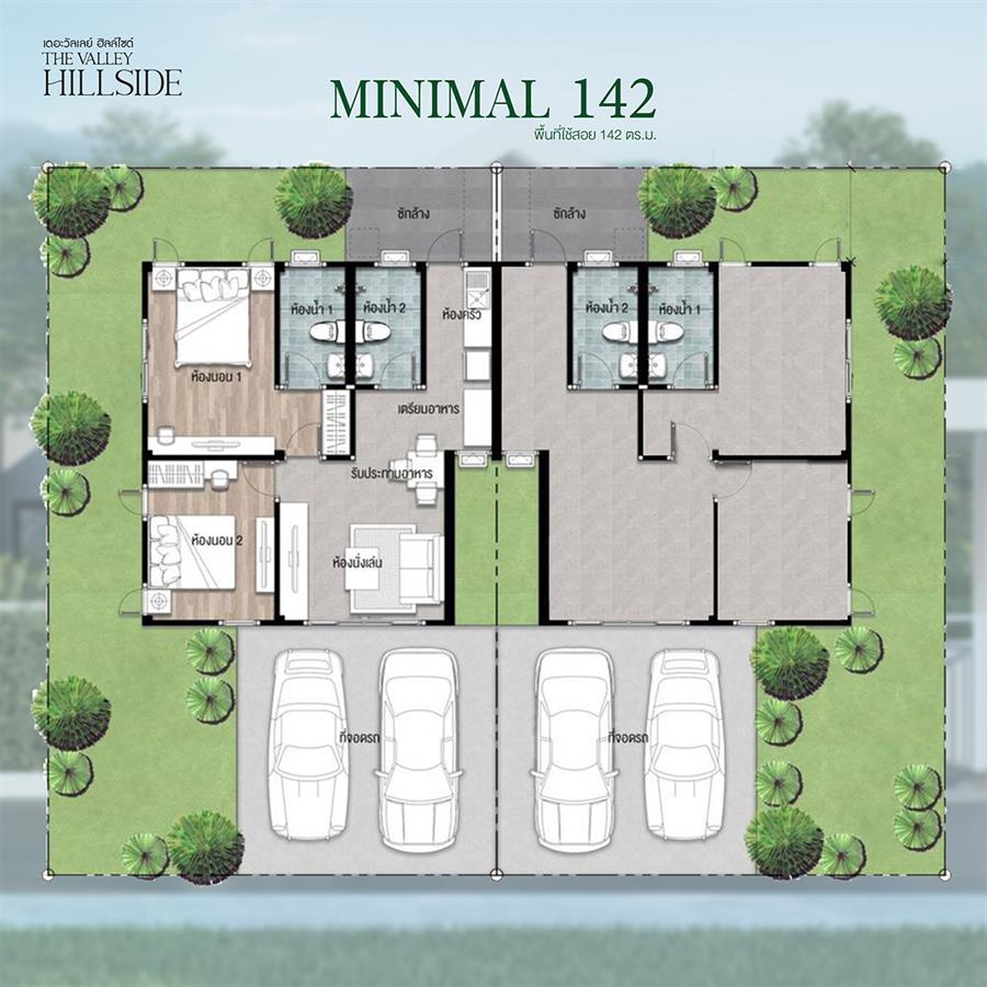- บ้านแฝด Minimal 142 : หน้ากว้าง 9.50 เมตร พื้นที่ใช้สอย 142 ตารางเมตร* ฟังก์ชัน 2 ห้องนอน 2 ห้องน้ำ 1 ห้องนั่งเล่น ที่จอดรถ 2 คัน