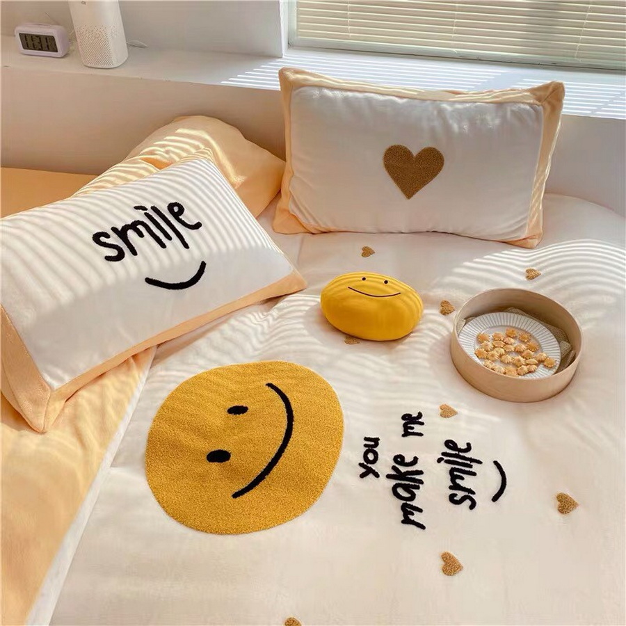 เซตผ้าปูที่นอนผ้ากำมะหยี่ 100% ลาย Smiley face สไตล์เกาหลี ราคาเริ่มต้น 2,690 บาท จากร้าน bowbunny