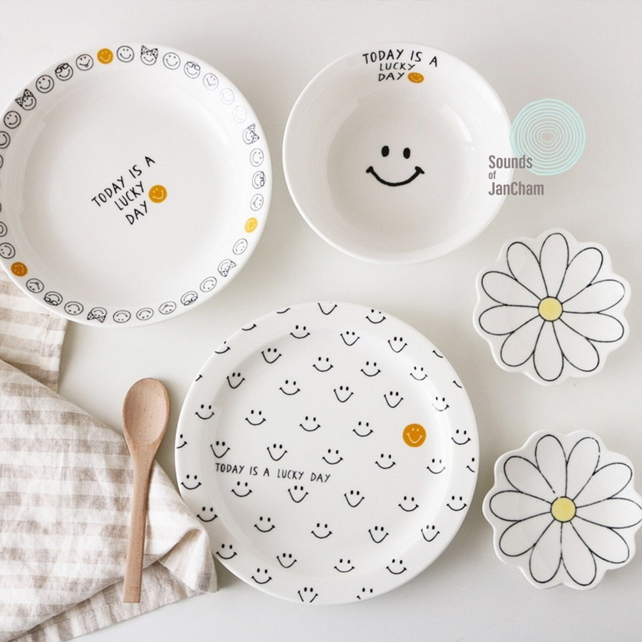 เซตจานชามเซรามิกเกรดพรีเมี่ยมโทนสีขาวสะอาดตาลาย Smiley "Today is a lucky day" สามารถนำเข้าเตาอบไมโครเวฟได้ ราคา 169 บาท จากร้าน soundsofjancham