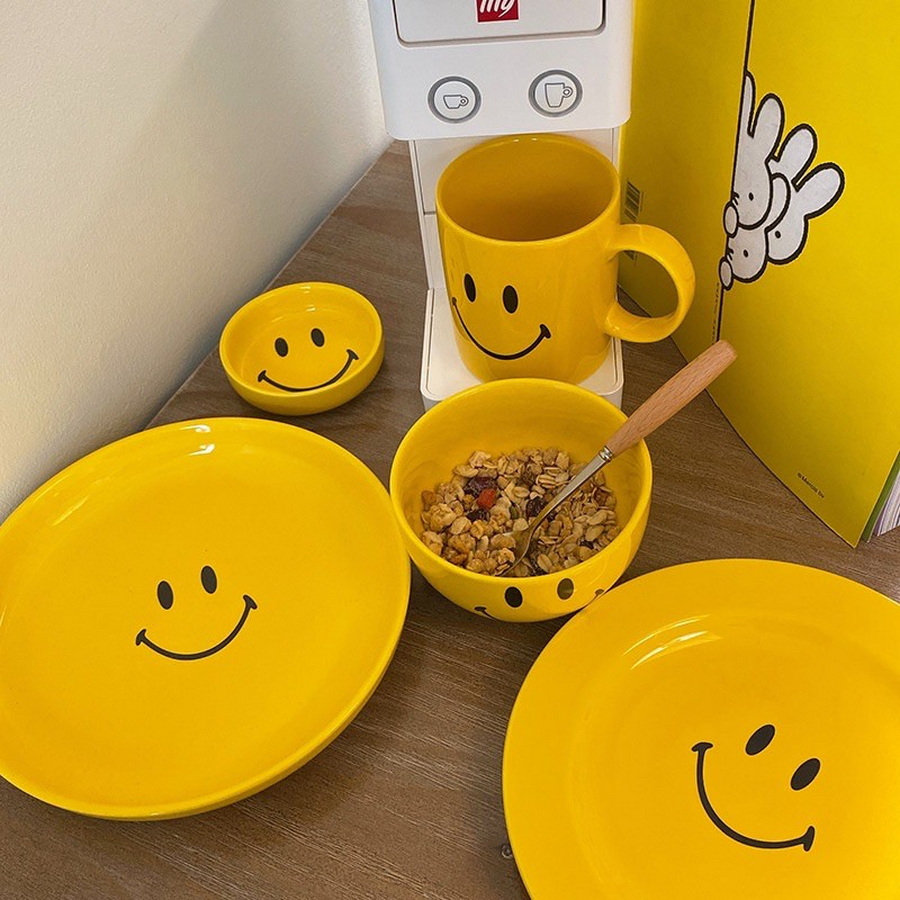 เซตจานเซรามิกโทนสีเหลือง Smiley ด้านหน้าเป็นลายสมายลี่สุดคิ้วท์ สามารถนำเข้าไมโครเวฟ ราคา 90 บาท จากร้าน haaus.co