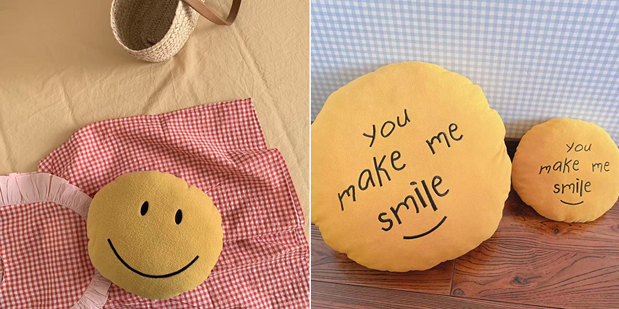 หมอนอิงทรงกลมนุ่มนิ่ม ด้านหน้าเป็นรูปรอยยิ้ม ด้านหลังมีข้อความ "you make me smile" ราคา 119 บาท จากร้าน whatyouwant.8