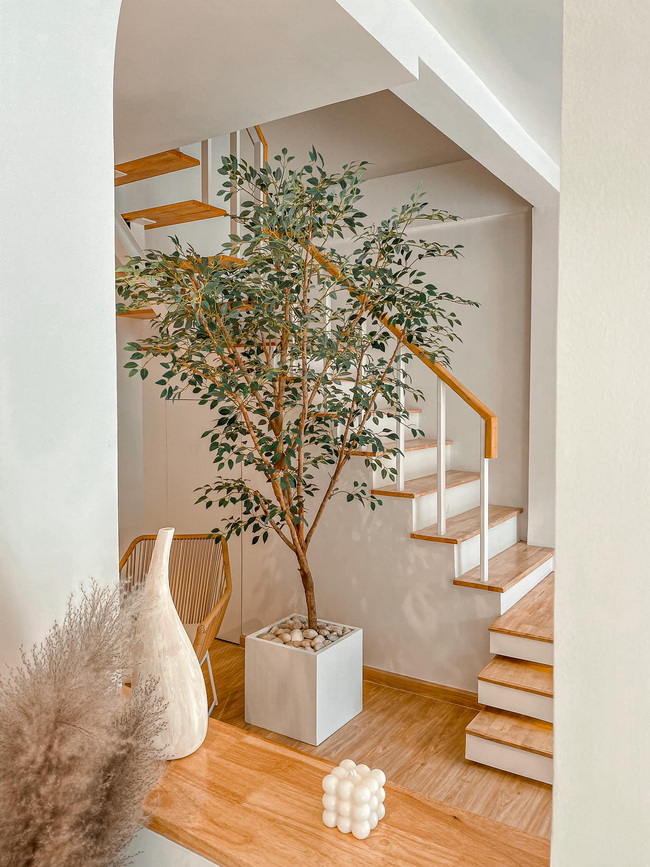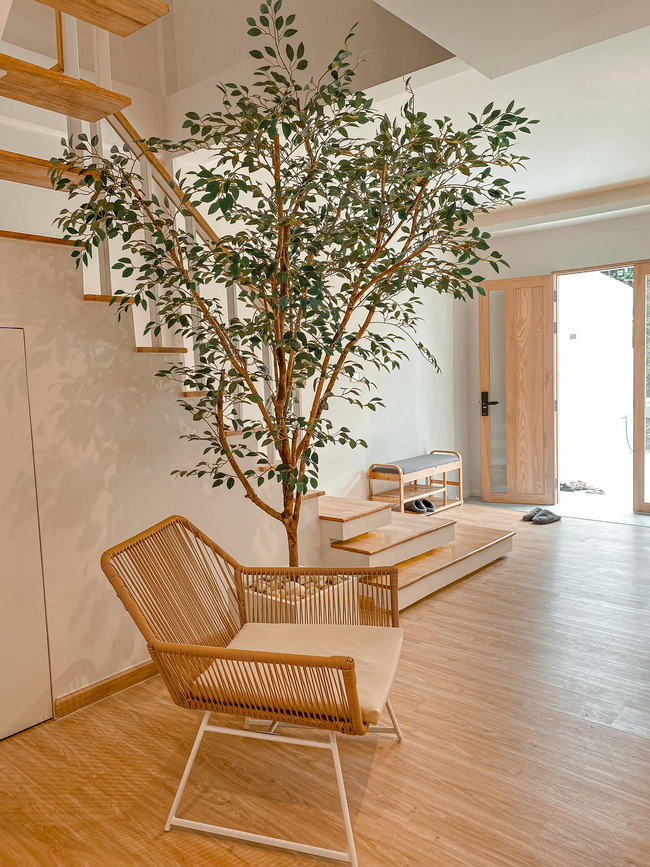 ชั้นล่างปูด้วยพื้นไม้ SPC 5.5 มม. แบบคลิกล็อค ตั้งต้นไม้ปลอมเพิ่มสีเขียวเติมความสดชื่นให้บ้าน