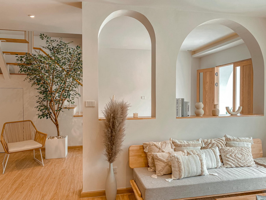 เข้ามาโซนแรกเป็นห้องนั่งเล่น ในส่วนที่เป็นงานเสาต่างๆ ของบ้าน พยายามซ่อนแบบเนียนๆ โดยการออกแบบเป็นซุ้มโค้งให้ดูสวยงาม