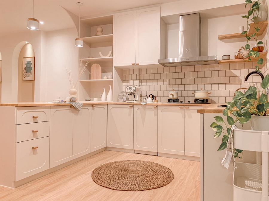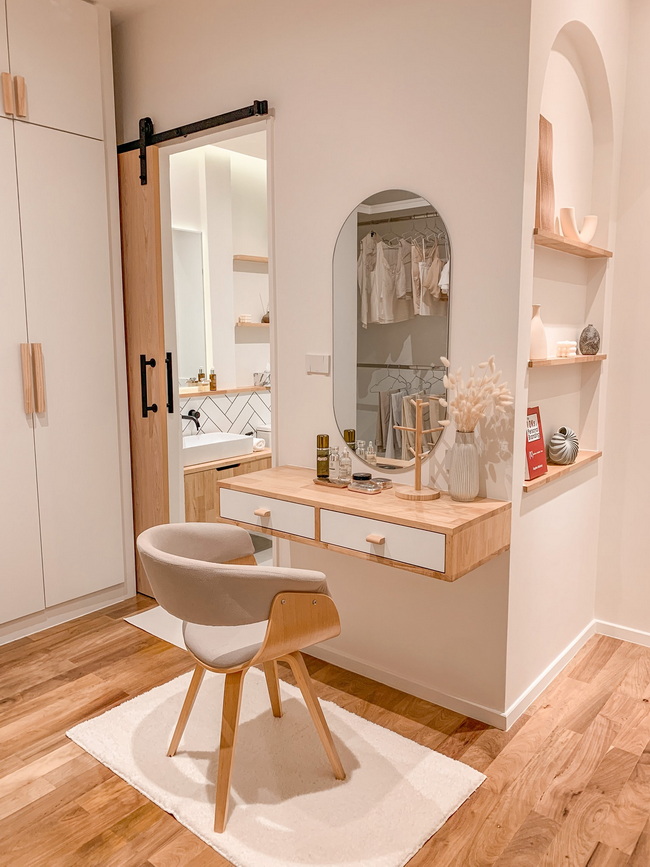 หน้าบานตู้เก็บของออกแบบให้มีความโค้งมน ใช้โทนสีอ่อนให้เข้ากับสีของไม้