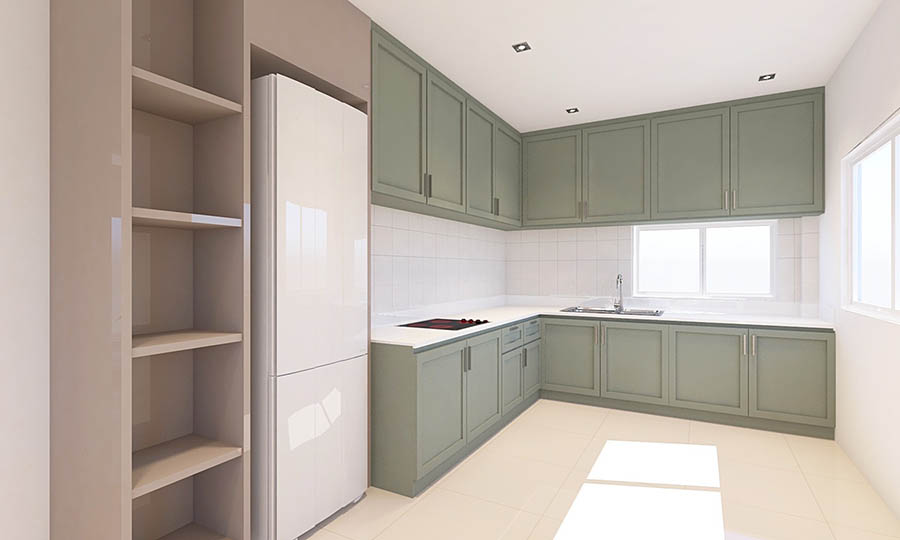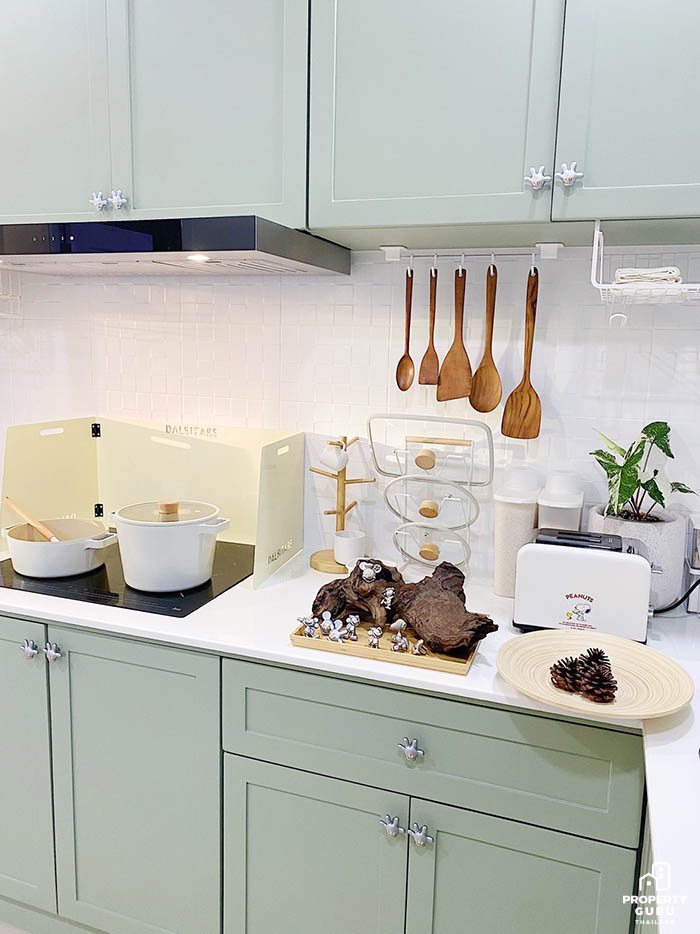 ครัวสีเขียวรูปตัว L ที่แสนจะอบอุ่นนี้ทำเสร็จมา 1 ปีแล้ว คุณเมย์บอกกับเราว่า "สำหรับงานออกแบบและฝีมือช่างบิวท์อิน เมย์พอใจมากๆ ตู้ใส่ของได้ตามต้องการของเมย์ ส่วนตู้แขวนที่สูงๆ ก็ไว้เก็บของที่ใช้ไม่บ่อย หรือของที่เมย์ซื้อมาสต็อกหลายๆ ชิ้น เวลาจะหยิบใช้ ก็ใช้เก้าอี้บันไดปีนขึ้นไปหยิบเอาค่ะ งานบิวท์อินส่วนมากจะทราบดีอยู่แล้วว่าไม่เน้นทำครัวหนักๆ เมย์ก็จะทำเมนูง่ายๆในแบบที่เมย์ถนัด" ด้านราคาสร้างตอนต้นปี 64 ประมาณ 309,200 บาท โดยแบ่งออกเป็นส่วนๆ ตามนี้