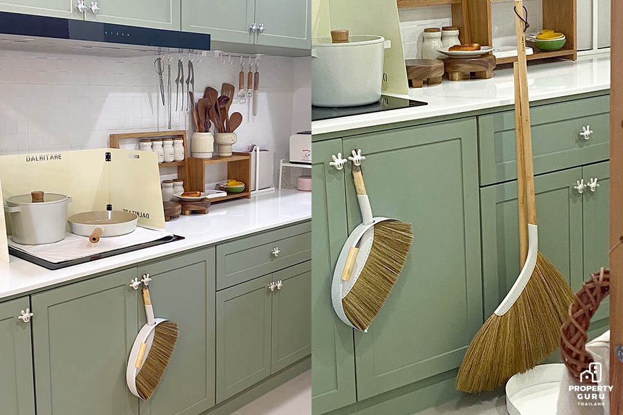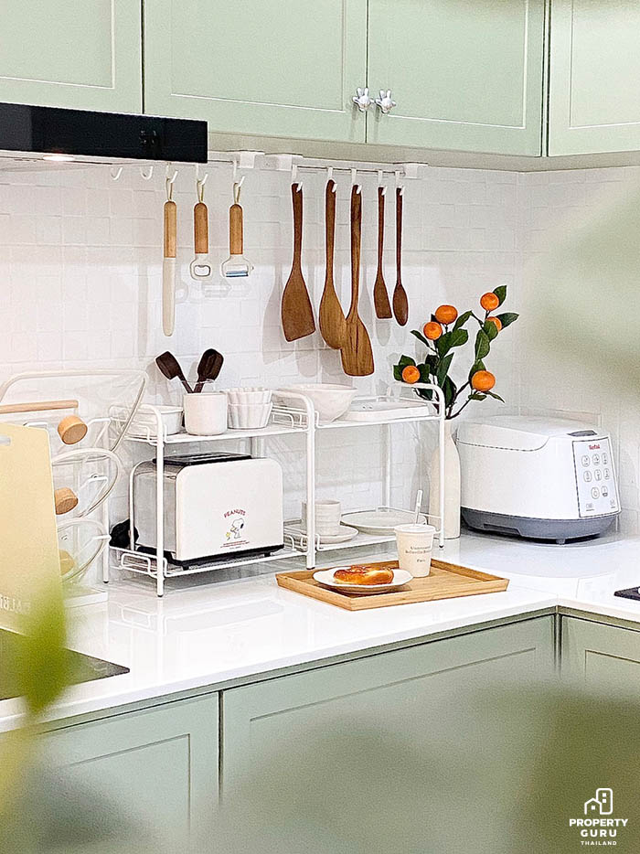 ของใช้ต่างๆ ถูกจัดวางอย่างสวยงามบนชั้นไม้ที่เข้ากับมากกับครัวสีเขียว