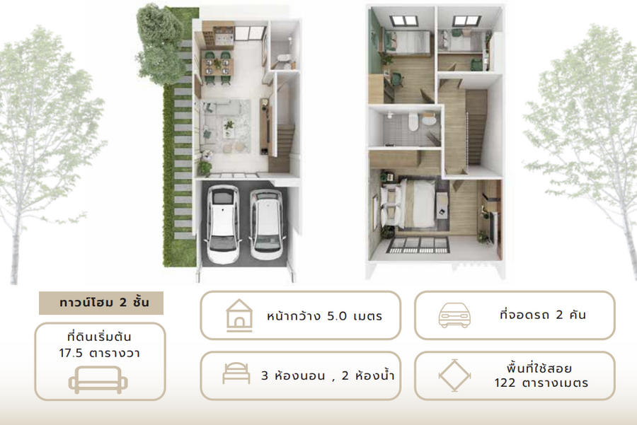 - Baby Birch : ทาวน์โฮม 2 ชั้น หน้ากว้าง 5 เมตร พื้นที่ใช้สอย 122 ตร.ม. ที่ดินเริ่มต้น 17.5 ตร.วา. 3 ห้องนอน 2 ห้องน้ำ ที่จอดรถ 2 คัน