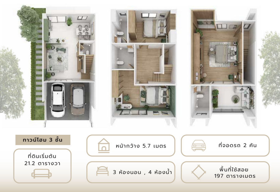 - Oaky Oak : ทาวน์โฮม 3 ชั้น หน้ากว้าง 5.7 เมตร พื้นที่ใช้สอย 197 ตร.ม. ที่ดินเริ่มต้น 21.2 ตร.วา. 3 ห้องนอน 4 ห้องน้ำ ที่จอดรถ 2 คัน