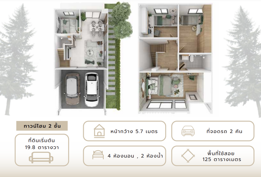 - Piney Pine : ทาวน์โฮม 2 ชั้น หน้ากว้าง 5.7 เมตร พื้นที่ใช้สอย 125 ตร.ม. ที่ดินเริ่มต้น 19.8 ตร.วา. 4 ห้องนอน 2 ห้องน้ำ ที่จอดรถ 2 คัน