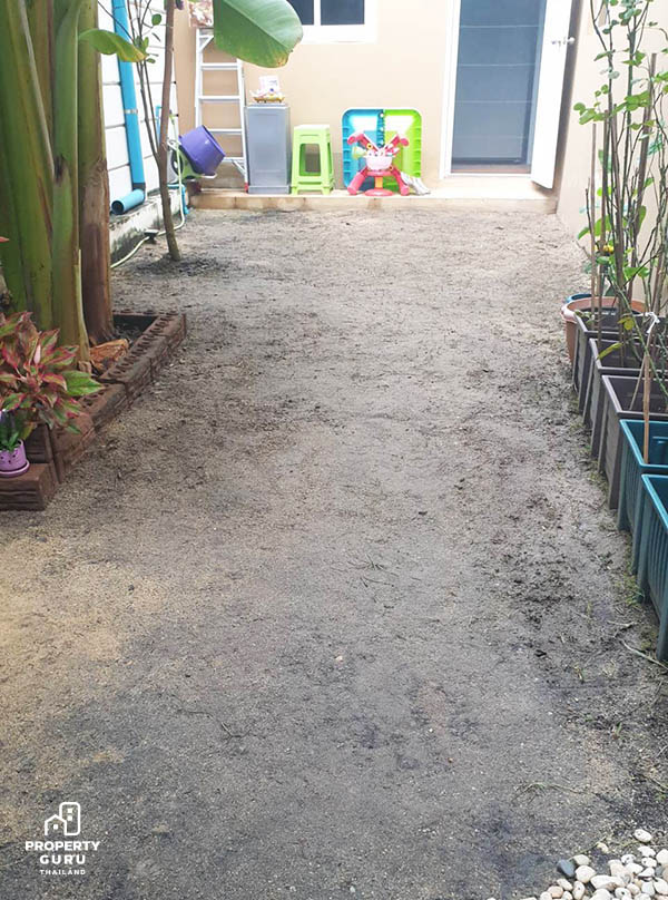 จากนั้นปรับหน้าดินให้เรียบ รดน้ำให้ชุ่ม 1 รอบ โดยหญ้าที่คุณยุ้ยนำมาปลูกเลือกซื้อจากเพจใน Facebook เลือกจากร้านที่ถูกที่สุด เพราะปลูกเป็นครั้งแรก หากซื้อแพงแล้วหญ้าตายจะได้ไม่เสียดายเงินมากนัก ราคาหญ้าอยู่ที่ 750 บาท/10 ตร.ม.
