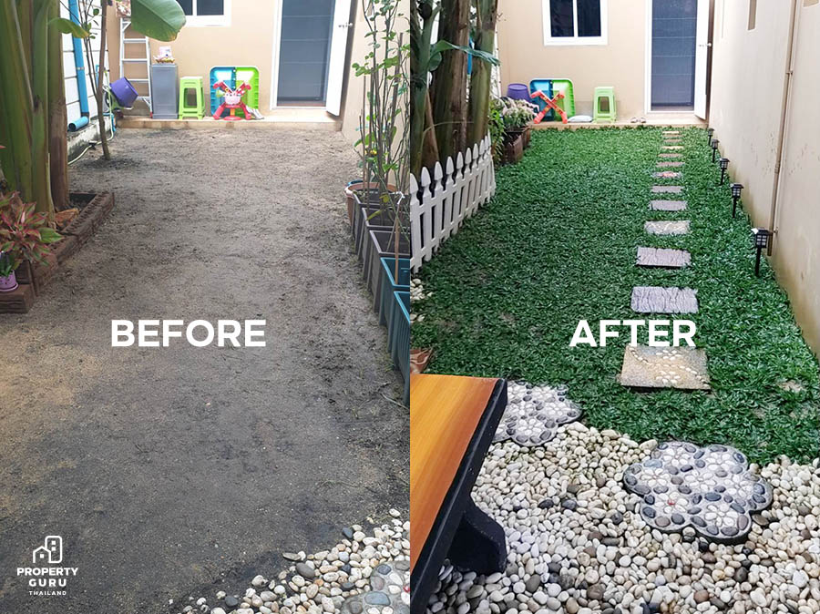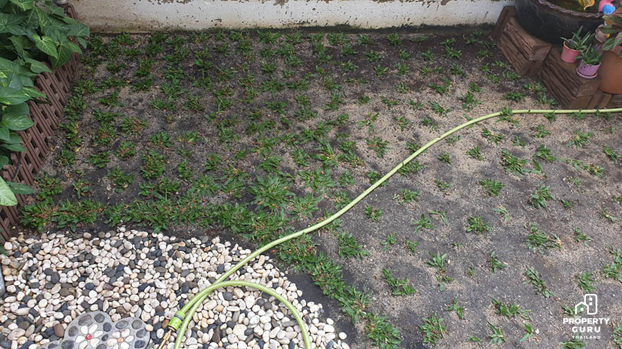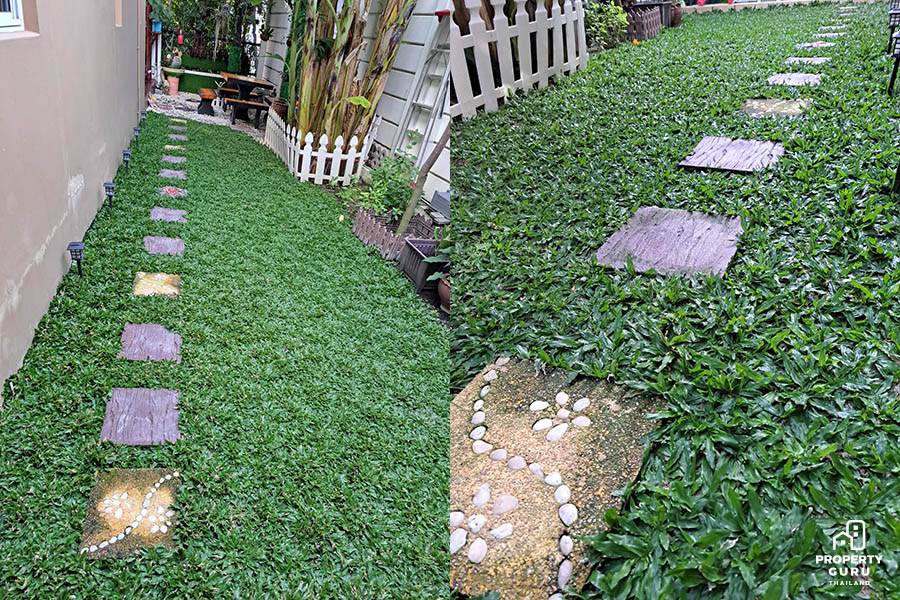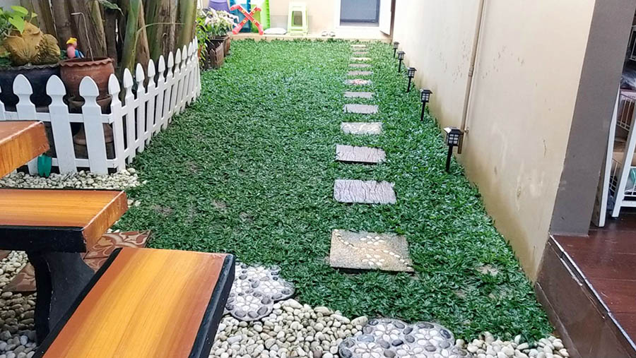 คุณยุ้ยเล่าให้ฟังว่าเมื่อก่อนก็เคยปลูกหญ้าญี่ปุ่นเหมือนกัน เพียงแต่ว่าจะลำบากหน่อยตรงที่รดน้ำบ่อย แล้วยังต้องคอยตัดหญ้าอยู่บ่อยๆ และถ้าตัดไม่เสมอกันหญ้าจะชี้ ไม่สวยงาม พอเราตัดลึกเกินไปหญ้าส่วนล่างก็จะเป็นสีเหลือง เพราะหญ้าสูงแล้วส่วนล่างไม่โดนแดด เลยมีความคิดที่จะเปลี่ยน