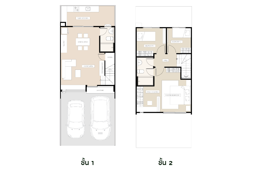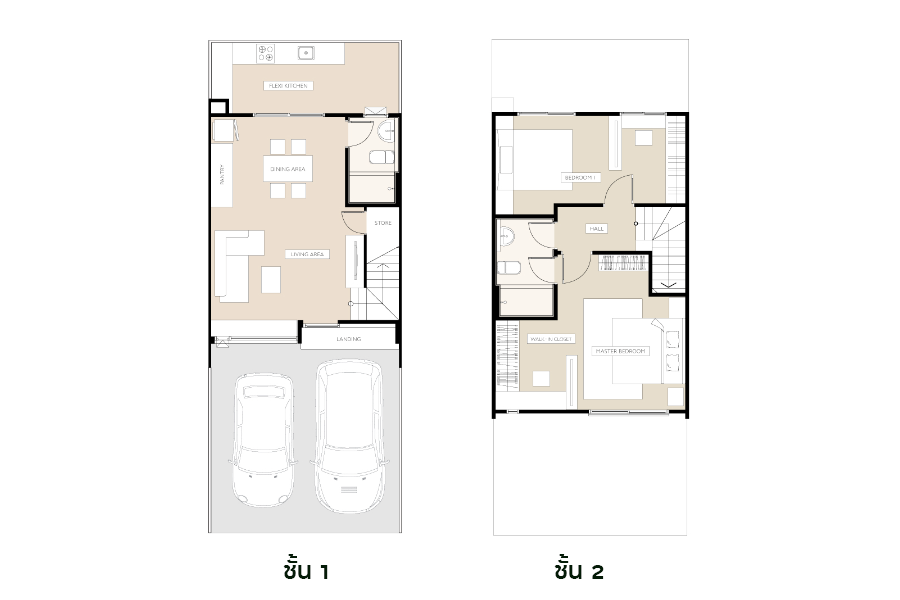 - Double master bedroom : ทาวน์โฮม 2 ชั้น พื้นที่ใช้สอย 115 ตร.ม. ที่ดินเริ่มต้น 18 ตร.วา. 2 ห้องนอน 2 ห้องน้ำ ที่จอดรถ 2 คัน
