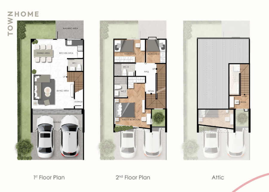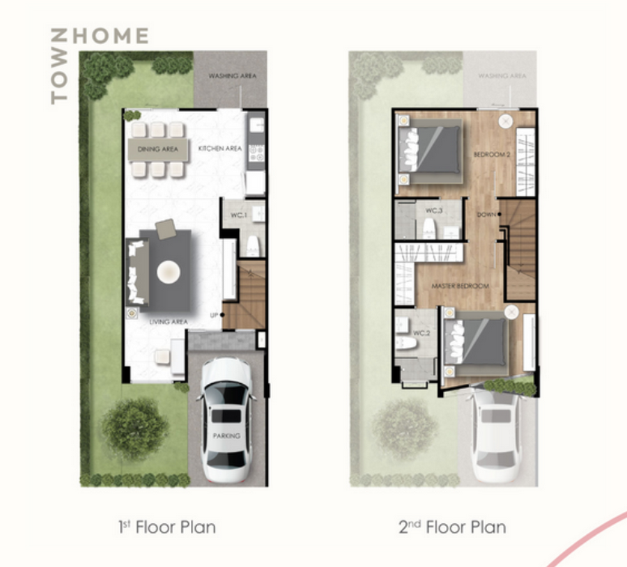 - 3 Bedroom : ทาวน์โฮม 2 ชั้น หน้ากว้าง xx เมตร พื้นที่ใช้สอย 115 ตร.ม. ที่ดินเริ่มต้น 18 ตร.วา. 3 ห้องนอน 2 ห้องน้ำ ที่จอดรถ 2 คัน